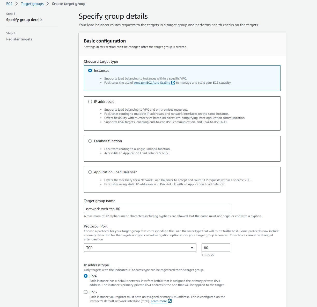 To load balance, the first thing needed is a target group, which can be configured as follows: